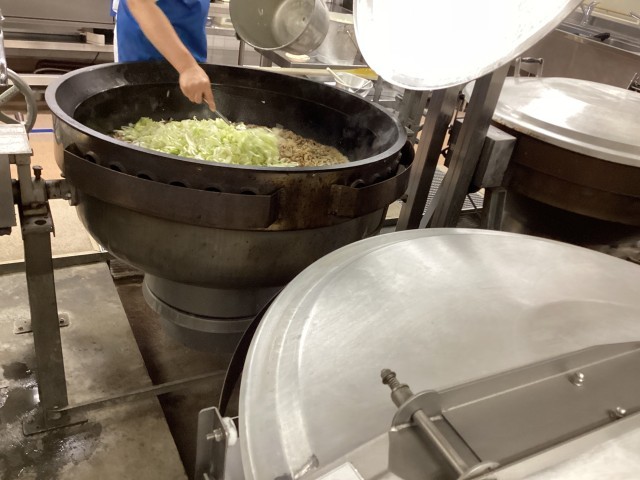 豚丼の具をつくっています。長ねぎは甘味や食感を出すために、2回に分けて加えて煮ています。