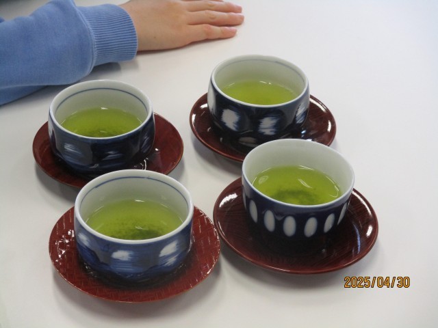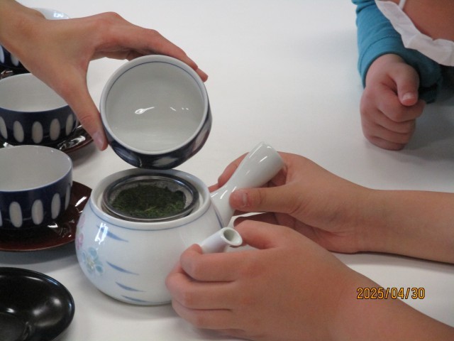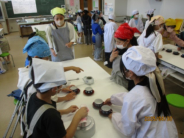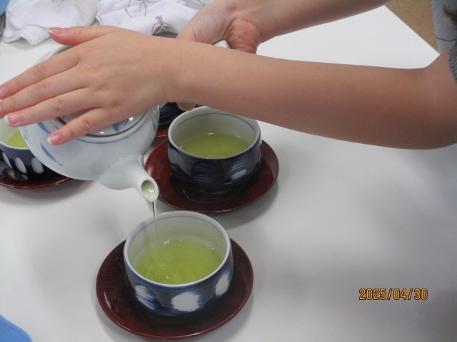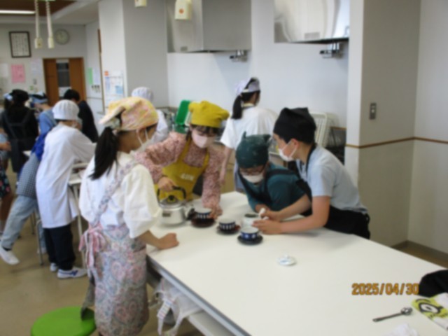 5年生が調理実習でお茶を入れました。湯呑に入れた湯を急須に戻して適温にしたり、回し注ぎをして均等な濃さや量にしたり、学んだことを生かして取り組みました。「おいしい」という声があちらこちらから聞こえました。
