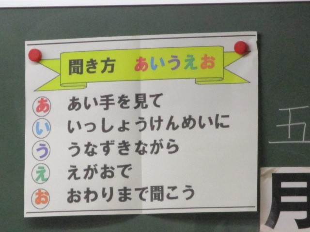 上:「聞くこと」は「話すこと」と同じくらい大切です。2年生の教室に、上手に聞くためのポイントが掲示してあります。「聞き方」名人が増えると良いです。