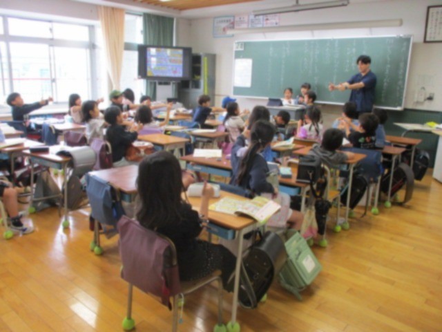 中:2年生の帰りの会です。先生や子どもたちが今日頑張った子を発表し、名前が挙がった子には皆でグーサインと「ヒーロー」という言葉をプレゼントします。心温まる場面です。
