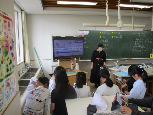 下:5年生の家庭科です。学習した内容をタブレットを使ってクイズで確認しています。誰が一番早く答えられたか分かるので、とても盛り上がります。