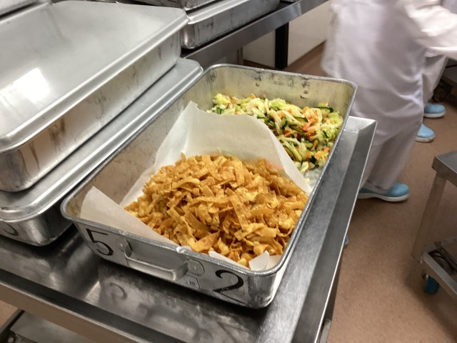 ワンタンの皮を素揚げしてサラダに乗せたパリパリサラダは人気があるメニューです。ワンタンのパリパリを楽しめるように、食缶の中も工夫して盛り付けています。