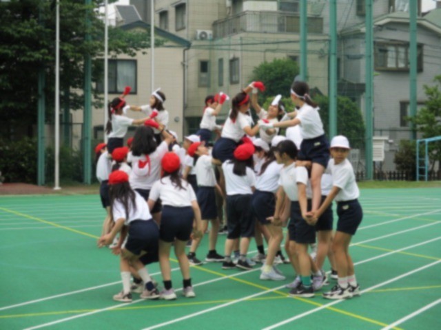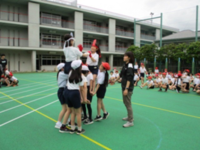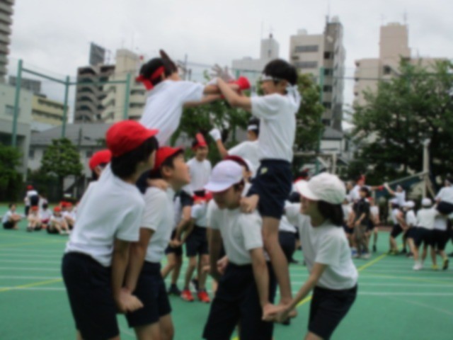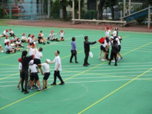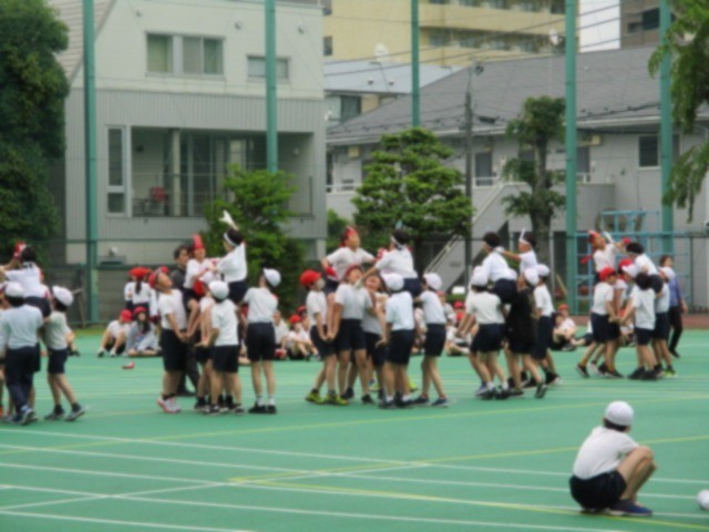 騎馬戦の練習です。事前に騎馬の組み方やルールなどを丁寧に指導されていたため、安全にそして熱い戦いが見られました。団体戦と個人戦があります。子どもたちの真剣勝負に御期待ください。