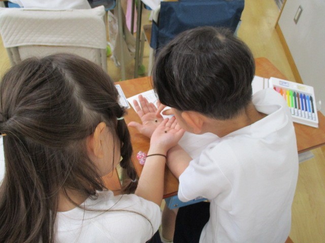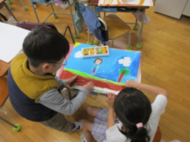 下:2年生が「すきなこと」をテーマに絵を描いています。塗る面積が広い子のお手伝いをしている姿が見られました。画用紙いっぱいに、思い思いの作品を仕上げました。