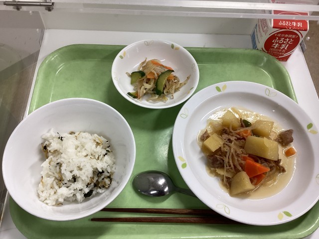 今日は定番献立の肉じゃがうま煮です。玉ねぎは2回に分けて甘味と食感を楽しめるように調理しています。じっくりと煮込んだ肉じゃがを、子どもたちはしっかりと食べていました。
