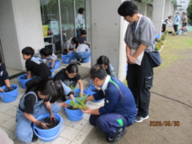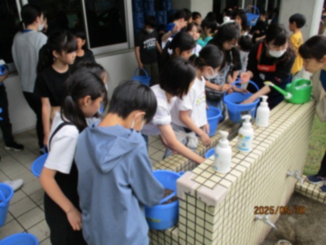 5年生が、パルシステムの皆様をお招きし、稲の育て方について教えていただきました。「土の硬さが耳たぶ位になるまで混ぜましょう」「苗を植えるときは、根が全て土の中に埋まるようにしましょう」などと、具体的に教えていただきました。1クラス分を集めてもおにぎり1個分にしかならないそうです。これからじっくりと稲に向かい合っていきます。