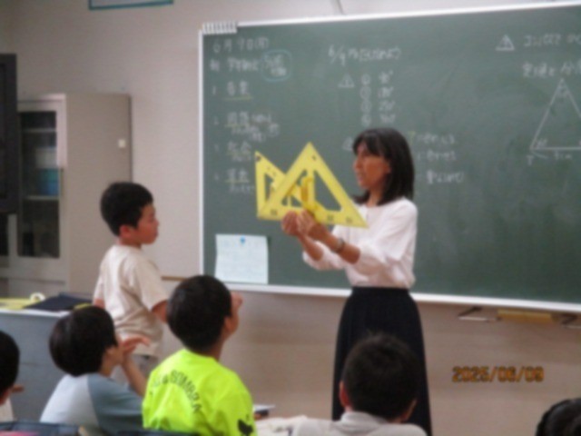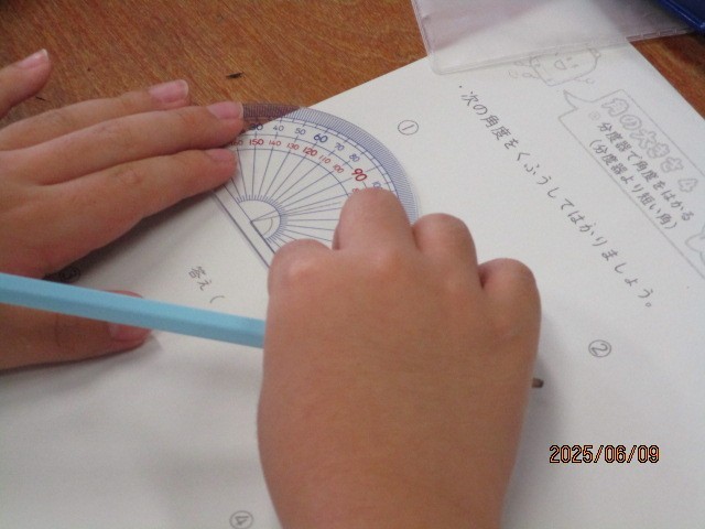 4年生は、「角の大きさ」の学習で分度器や三角定規の使い方を学んでいます。繰り返し作図したり実物に触れたりする中で、理解を深めています。