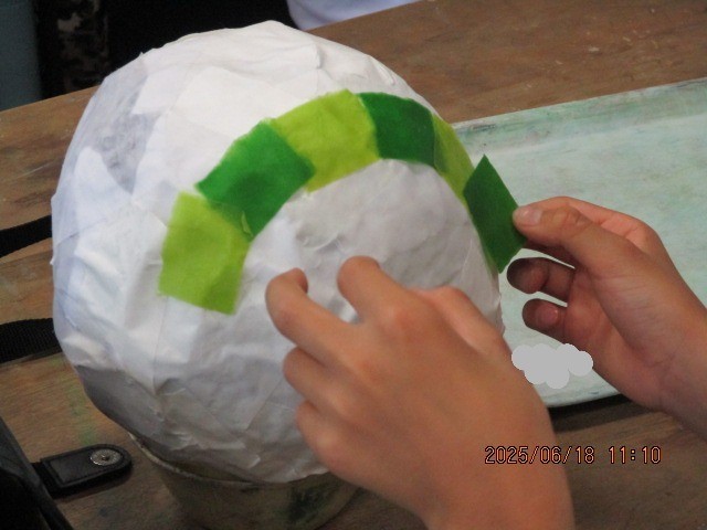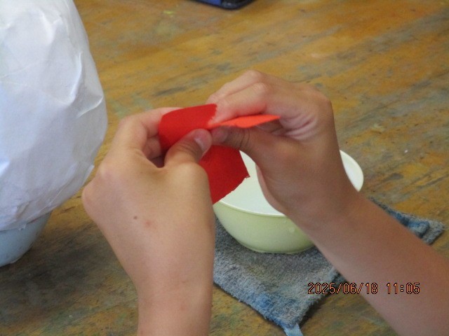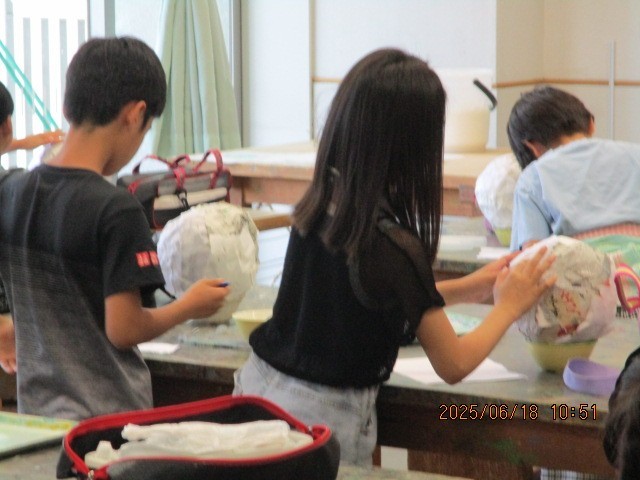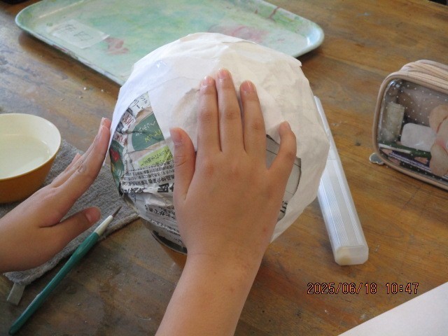 「世界に一つだけのだるま」を制作しています。新聞紙、半紙、民芸和紙の順で型に貼りつけていきます。どんなだるまができるかとても楽しみです。