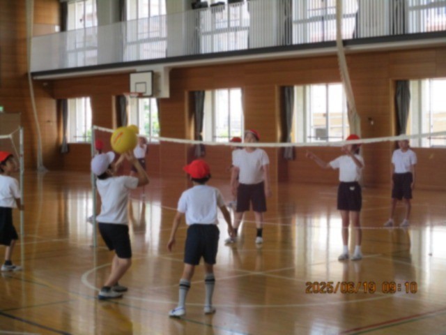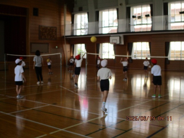 キャッチバレーボールに取り組んでいます。通常と違い、柔らかいボールを使ったり、キャッチしても良いというルールを加えたり、子どもたちの実態に合わせて運動しています。