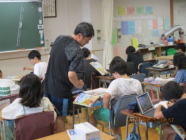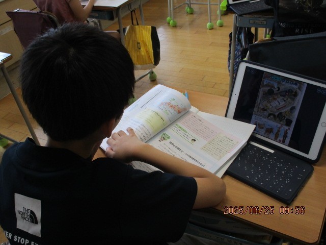 6年生は歴史を学んでいます。教科書や資料集、タブレットに送られてきた資料を見ながら、「古墳」について調べています。様々な資料から大切なことを探し出す力が身に付いてきています。