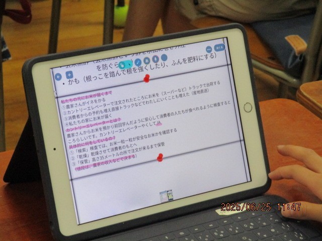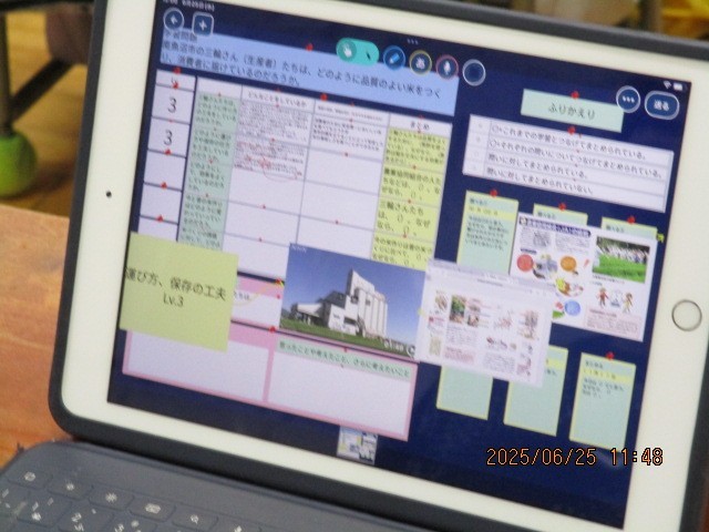 5年生は、米づくりについて学んでいます。毎時間の学びを1枚のシートにまとめているので、前の時間の内容を思い出したり、今回の内容と関連付けたりできます。どの子も自分の考えをしっかりまとめられていて立派でした。
