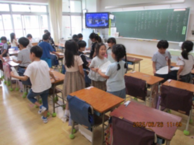 道徳の授業で、自分や友達の良いところを探しました。黒板に書いてあるように、友達の良いところをたくさん見つけられました。良いところを伝え合う時間があり、どの子も満面の笑みでした。