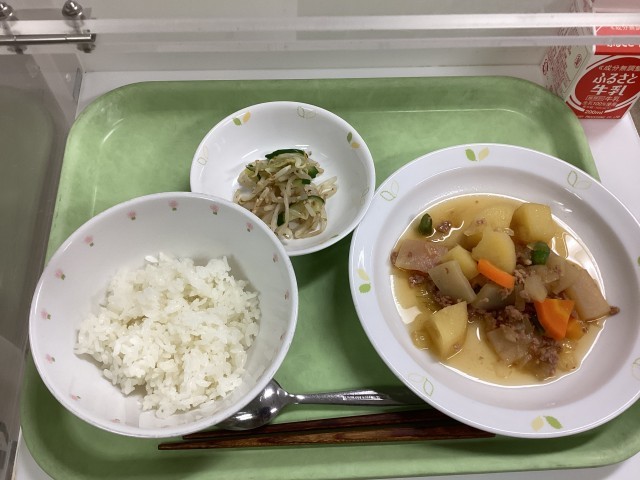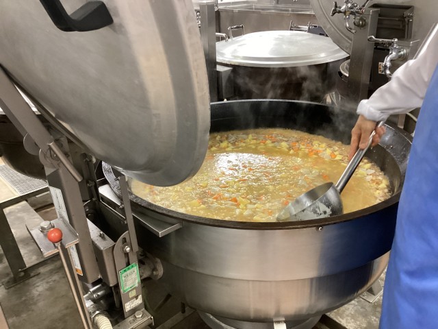 今日は毎月1回提供の有機米使用の給食です。有機米の白ごはんに合う和食のそぼろ煮にしました。豚ひき肉や野菜などから出るアクをしっかりと取り除きながら煮ています。