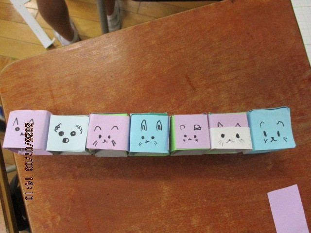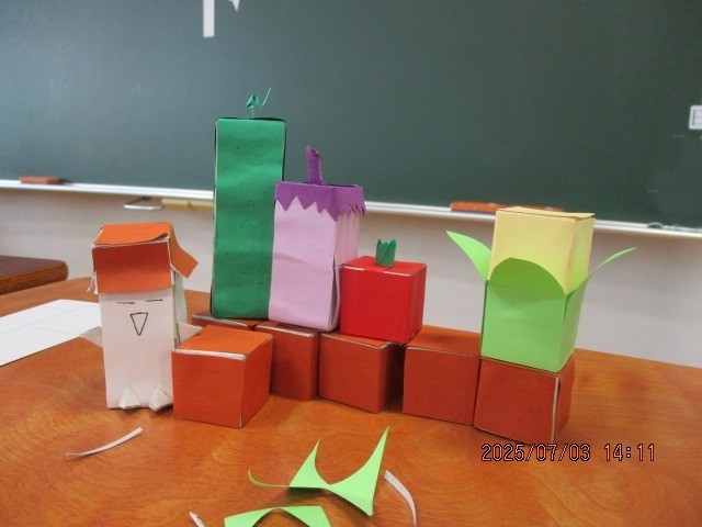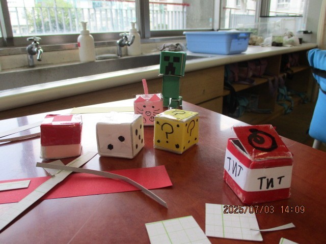 工作用紙から立体を作り、それを飾って作品を作っています。ゲームの影響か、サイコロ型を作る子が多いように思います。飾り付けたり書き加えたり、すてきな作品がたくさん誕生しました。中には、円柱や直方体に挑戦する子もいました。
