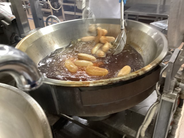 揚げパンは定番の人気メニューです。給食室で表面サクサク、中はふかふかの食感に揚げたパンは大人気です。ふっくらと揚がったパンにきな粉をまぶしていきます。