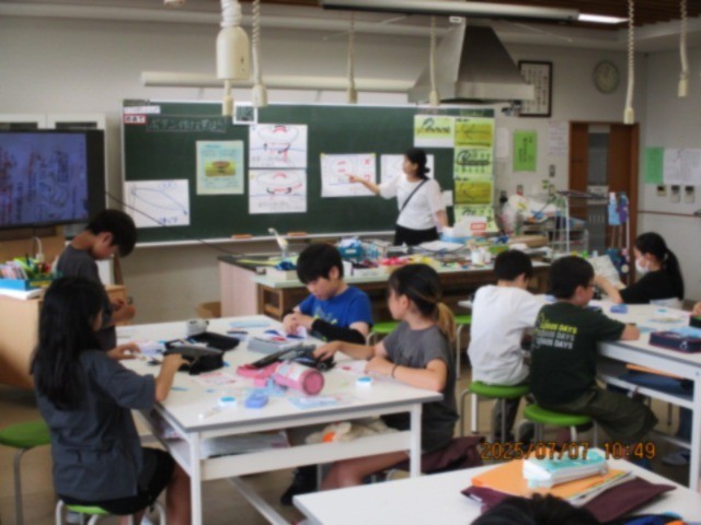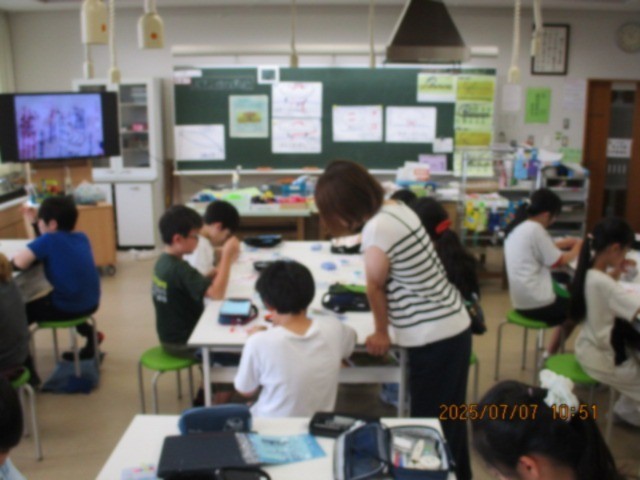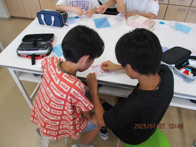 ボタン付けに挑戦中です。4つ穴、2つ穴、足つきの3種類あります。互いに教え合いながら仕上げています。今日は、担任もサポートに入っていました。