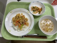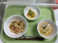 本日の献立*キムチチャーハン*牛乳*ワンタンスープ*きゅうりと大根のごま風味 キ...