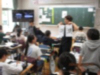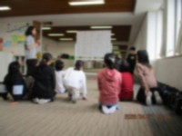 先生とジャンケンし、負けたら足下の新聞紙を1回折ります。かなり小さく折られた新聞...