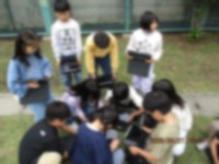 校庭の隅に子どもたちが集まって写真を撮っています。そこにはテントウムシがいました...