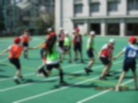 リレーに取り組んでいます。バトンパスの成否がタイムに大きく影響します。スピードを...
