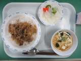 本日の献立 *豚丼 *牛乳 *かき玉汁 *野菜の甘酢あえ 食材産地 ...
