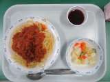 本日の献立 *スパゲテイミートソース *牛乳 *マセドアンサラダ *ぶど...