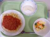 本日の献立 *スパゲッティミートソース *牛乳 *マセドアンサラダ *梨 今...