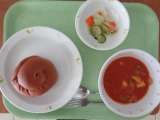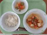 本日の献立 *ココアパン *牛乳 *トマトシチュー *グリーンサラダ トマト...