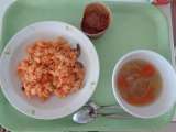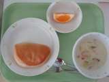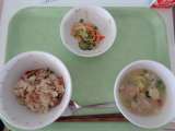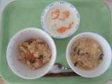 本日の献立 *中華風おこわ *牛乳 *かきたまスープ *フルーツヨーグルト ...