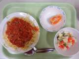本日の献立 *スパゲティミートソース *牛乳 *マセドアンサラダ *オレ...