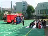 大きな消防車に、みんな驚いていました。 迫力満点の消防車をかいていました!
