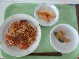 本日の献立 *ソース焼きそば *牛乳 *大根の中華味 *フライドポテト 焼...
