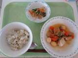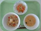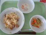 本日の献立 *鶏めし *牛乳 *かきたま汁 *こんにゃくサラダ 野菜とサラ...
