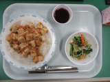 本日の献立 *麻婆豆腐丼 *牛乳 *ごま塩ナムル *ぶどうゼリー 食材...
