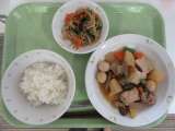 本日の献立 *ごはん *牛乳 *五目うま煮 *青菜のじゃこあえ 食材産...