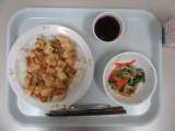 本日の献立 *麻婆豆腐丼 *牛乳 *ごま塩ナムル *ぶどうゼリー ...