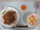 本日の献立 *ジャージャーうどん *牛乳 *マセドアンサラダ *冷凍みか...
