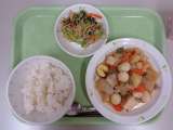 本日の献立 *ひじきごはん *牛乳 *つくね汁 *和風サラダ 食材産...