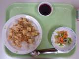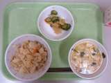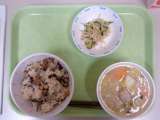 本日の献立 *中華風おこわ *牛乳 *かき玉スープ *きゅうりの中華あえ...