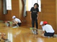 体力テストです。1・6年生がペアをつくり、6年生が1年生の計測の手伝いをしてい...