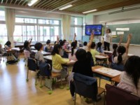 1年生の教室です。先生の質問に対して、ピンと腕を伸ばして手を挙げています。子ど...