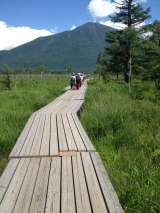 戦場ガ原では、木道の上を歩きます。 青空の下、男体山がはっきりと見えます。