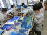 自分で選んだ色を使って、一人一人が海の世界を表現します。ローラーの使い方も工夫し...