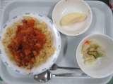 本日の献立 *チリビーンズライス *牛乳 *グリーンサラダ *りんご ...
