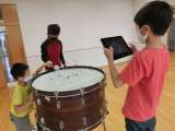 太鼓の音で綿が舞い上がる様子を確かめました、どのグループも友達と協力して役割分担...