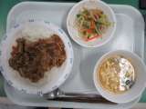 本日の献立 *回鍋肉丼 *牛乳 *かき玉スープ *ごま塩ナムル 食材...