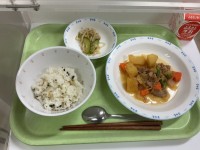 本日の献立*わかめとじゃこのごはん*牛乳*肉じゃがうま煮*もやしのごま風味 大き...