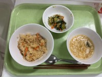 本日の献立*五目おこわ*牛乳*かきたま汁*野菜の磯あえ 真空冷却器で急冷したゆで...