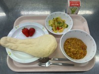 今日の給食は、ナン、牛乳、キーマカレー、にんじんドレッシングサラダ、くだもの(い...