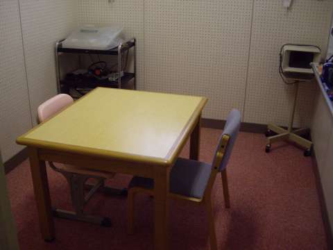 壁に鏡が取り付けられています。口の形を学習するときや発音練習で使っています。